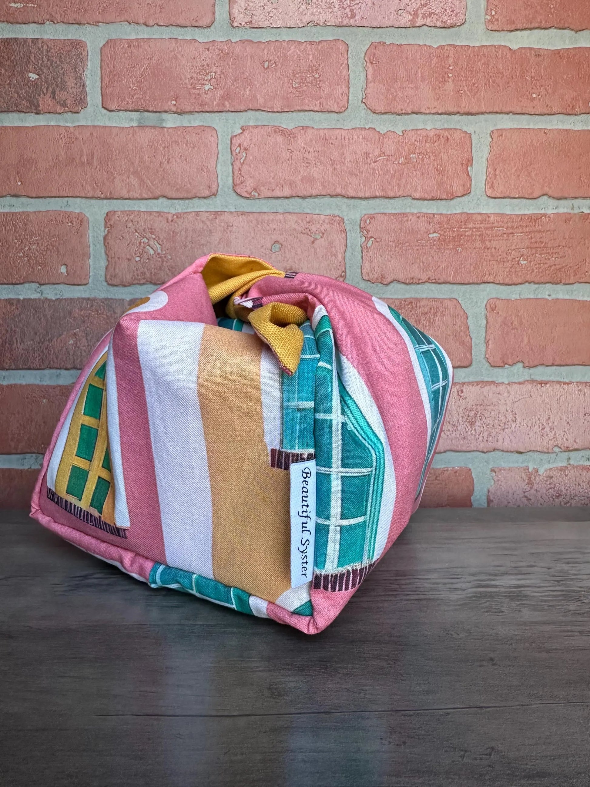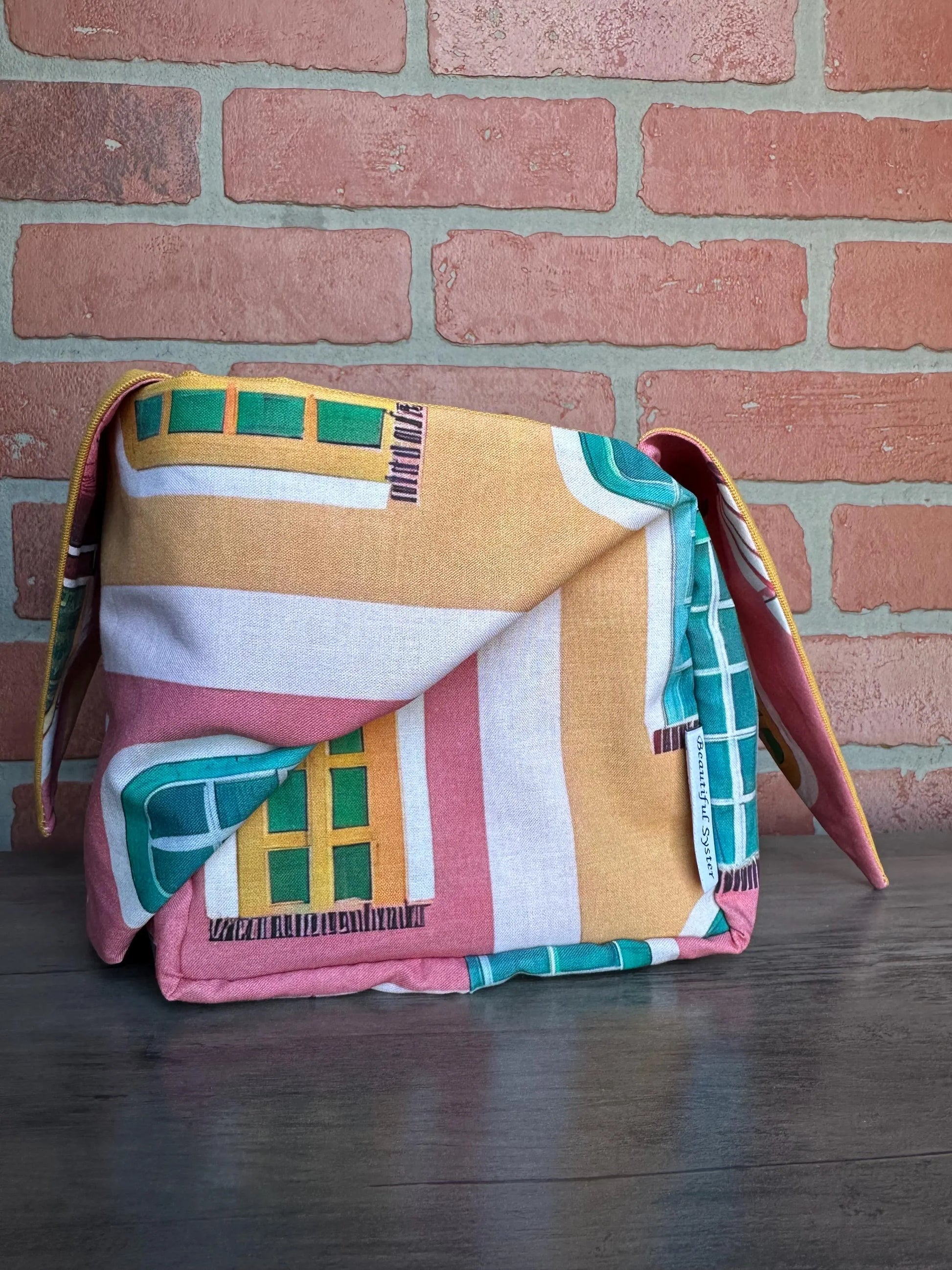 This is the perfect on the go project bag. You can carry your yarn in it and knit or crochet while walking or chasing your kids like I do. If you have to move fast just tie it up and all of your things stay safe inside.