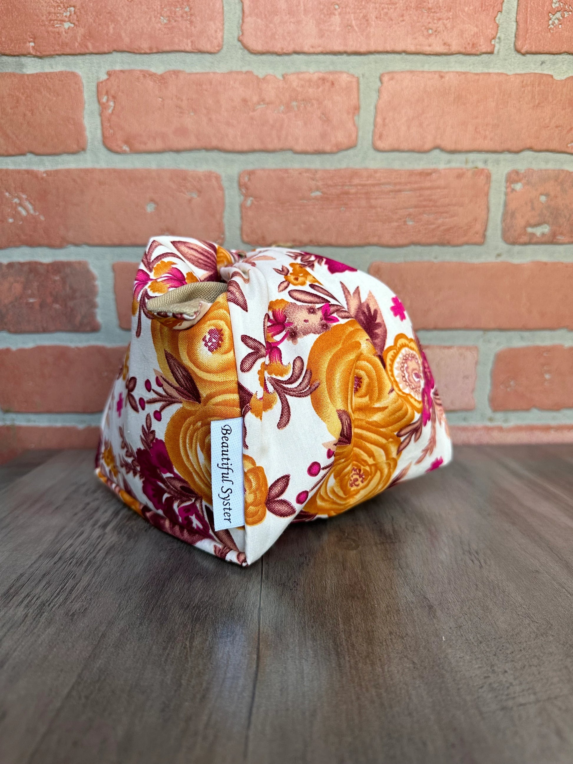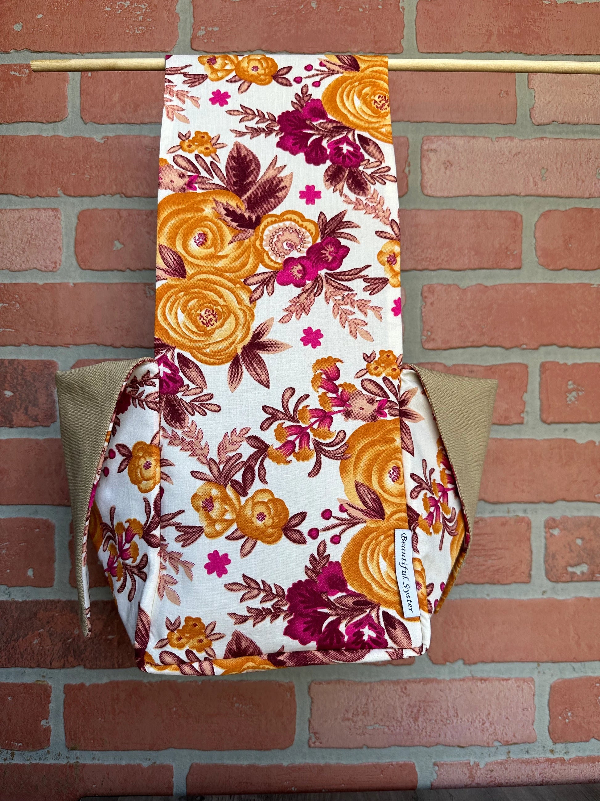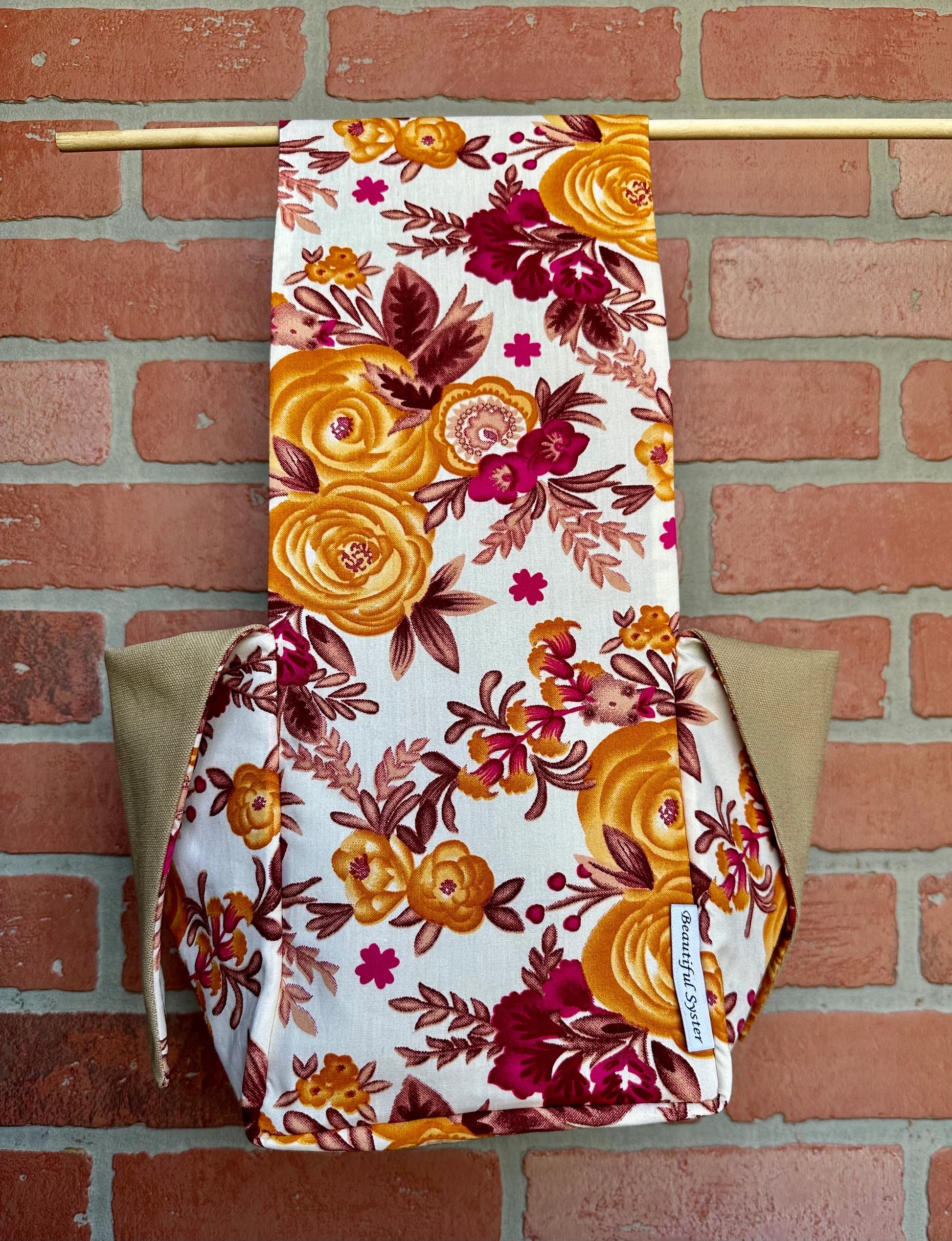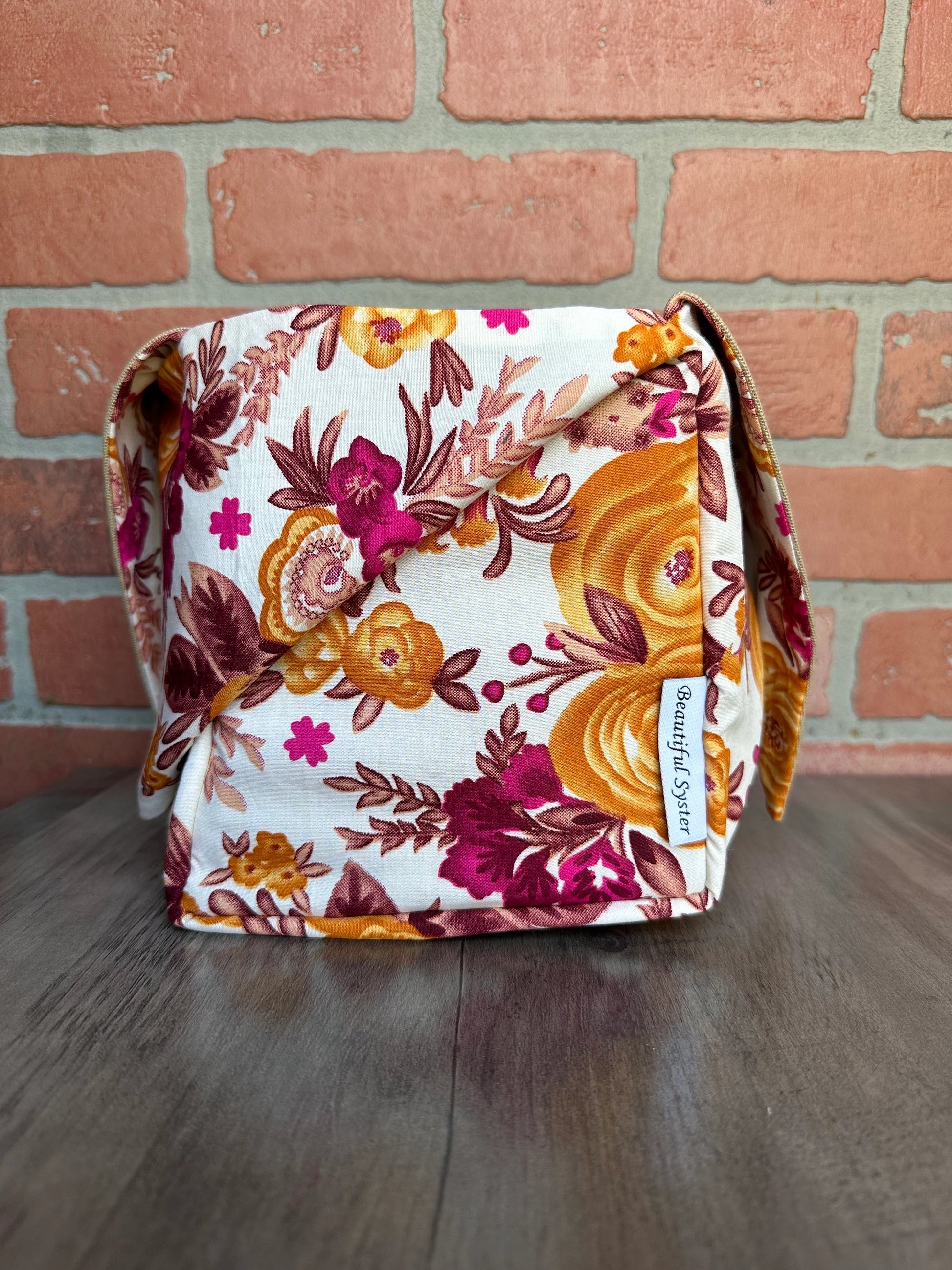 This is the perfect on the go project bag. You can carry your yarn in it and knit or crochet while walking or chasing your kids like I do. If you have to move fast just tie it up and all of your things stay safe inside.