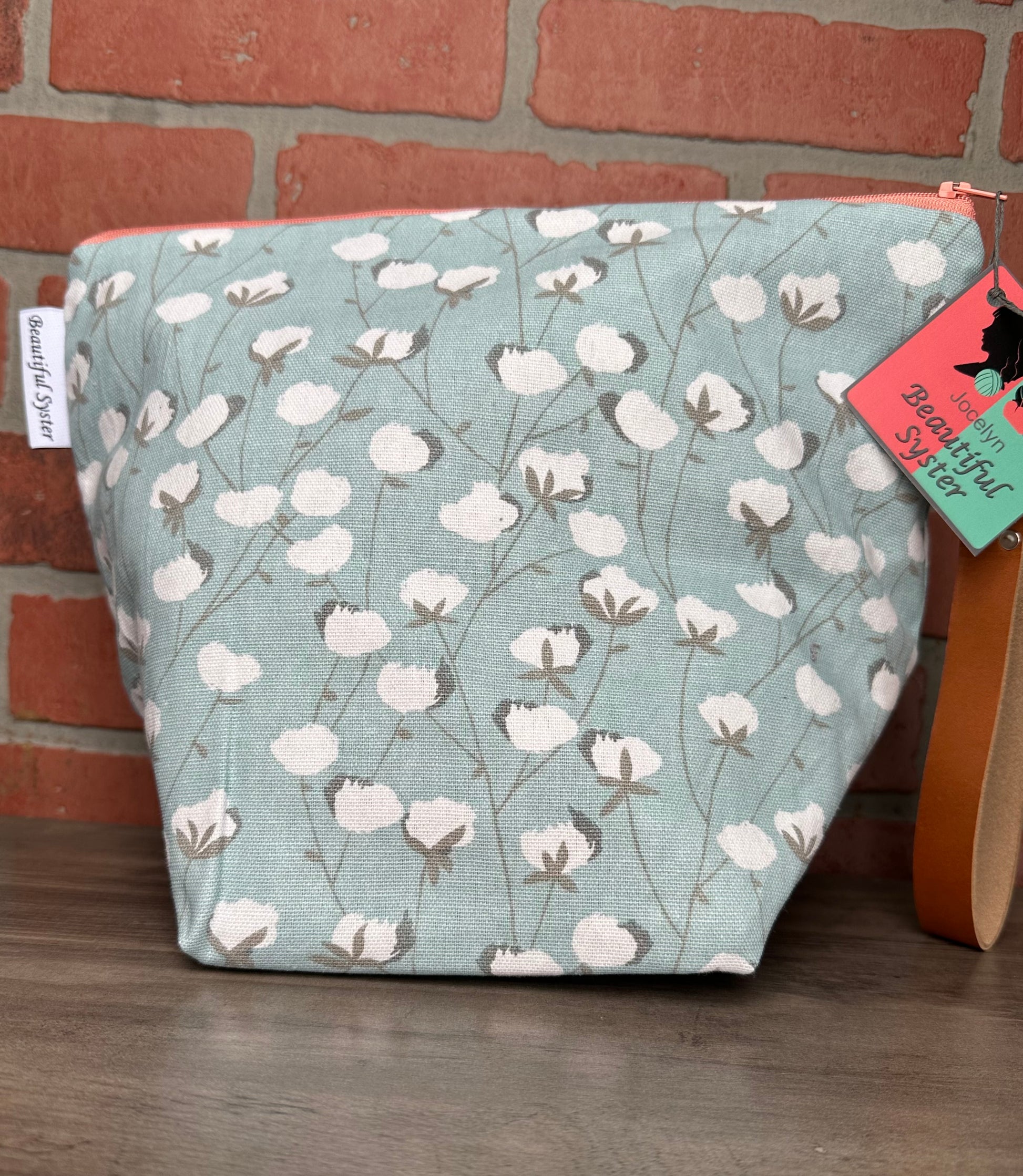 This is the bag for your sweater knitting. It fits your yarn, notions pouch, pattern, and anything else you may need for a project! It has three inside pockets and an attached leash. The leash is NOT for walking and knitting as this is a big bag.