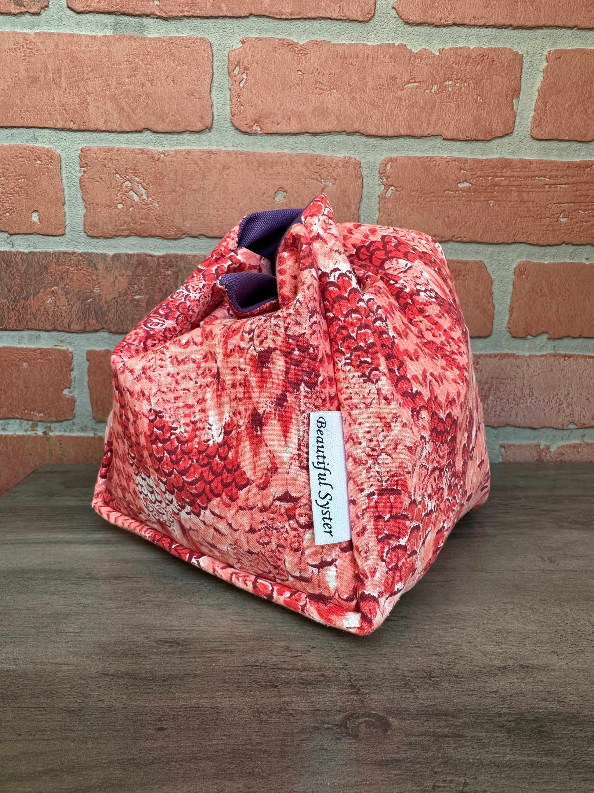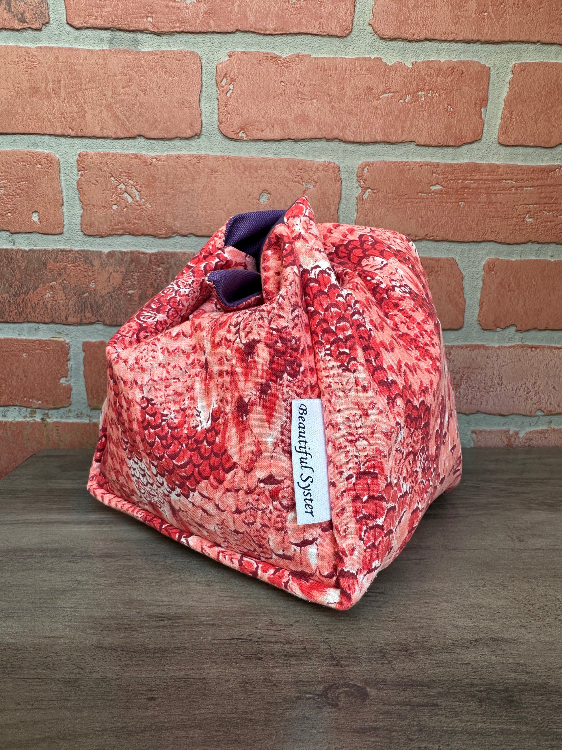 This is the perfect on the go project bag. You can carry your yarn in it and knit or crochet while walking or chasing your kids like I do. If you have to move fast just tie it up and all of your things stay safe inside.