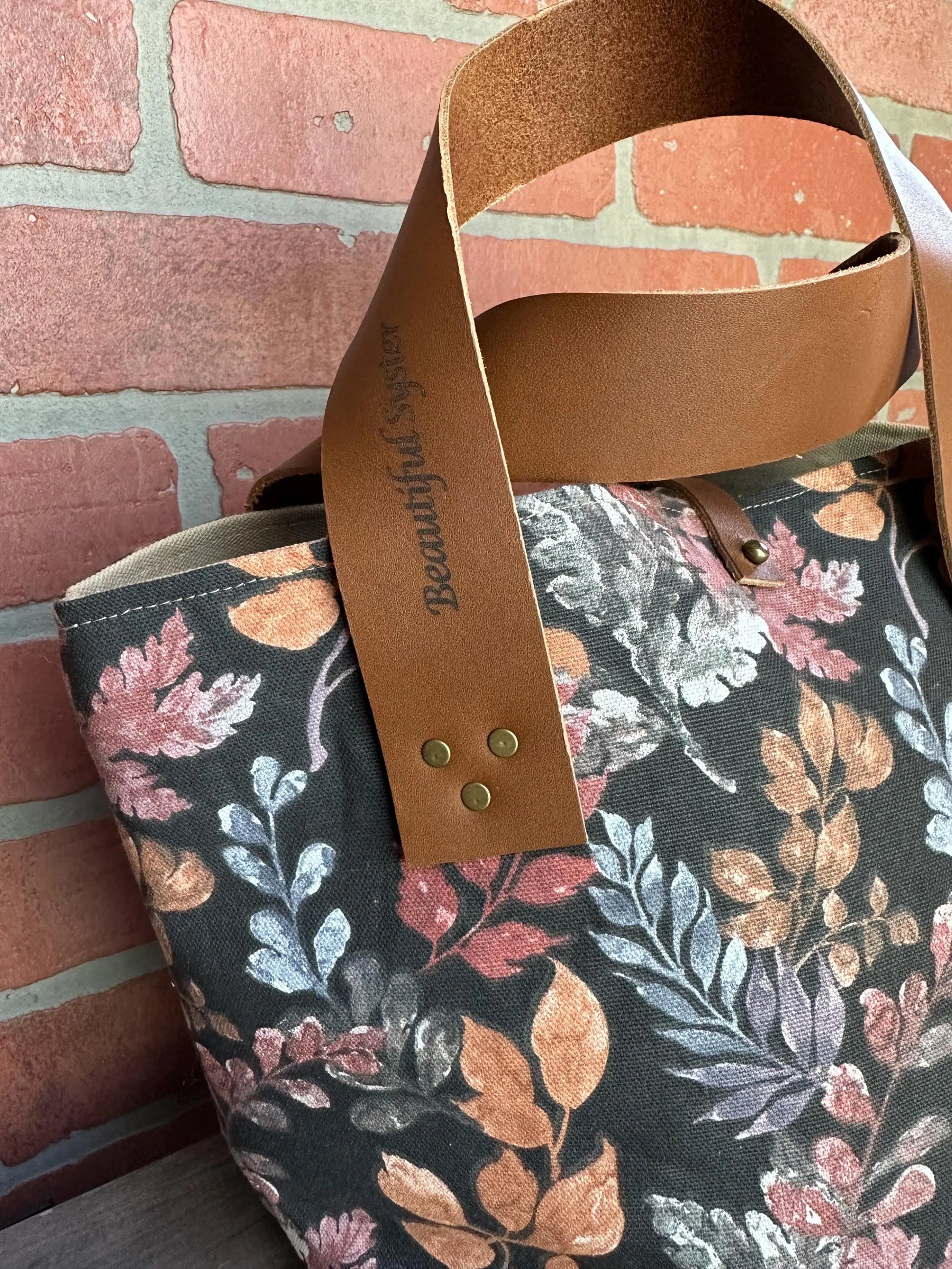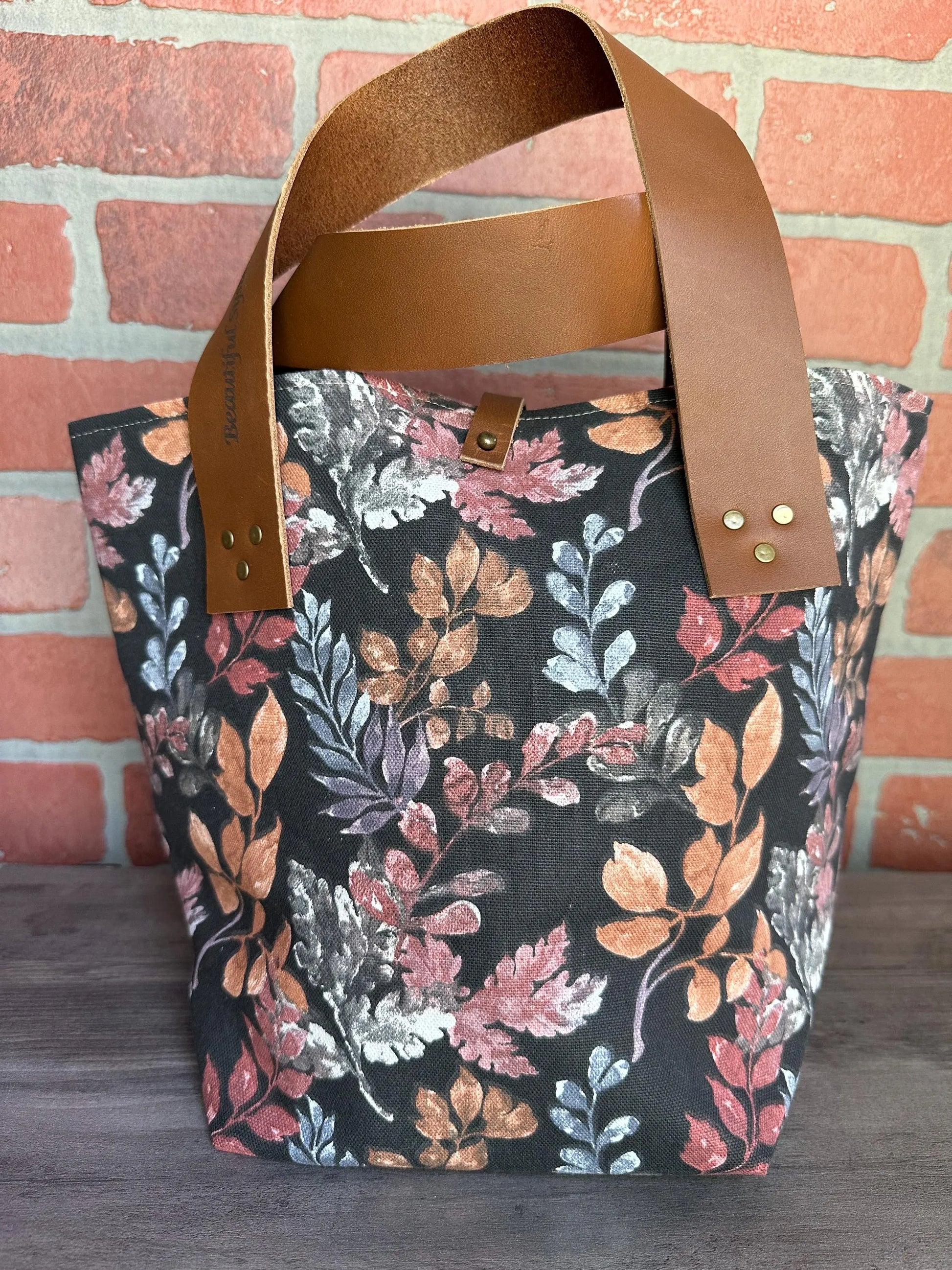 This is our perfect, bigger project bag. It has two pockets inside. A ring which opens on the inside to keep all your stitch markers safe! You keep it closed with a leather clasp, and it has two leather handles to carry around your yarn and everything else you need to knit larger projects like sweaters. You can also take it out with you to use as a handbag.