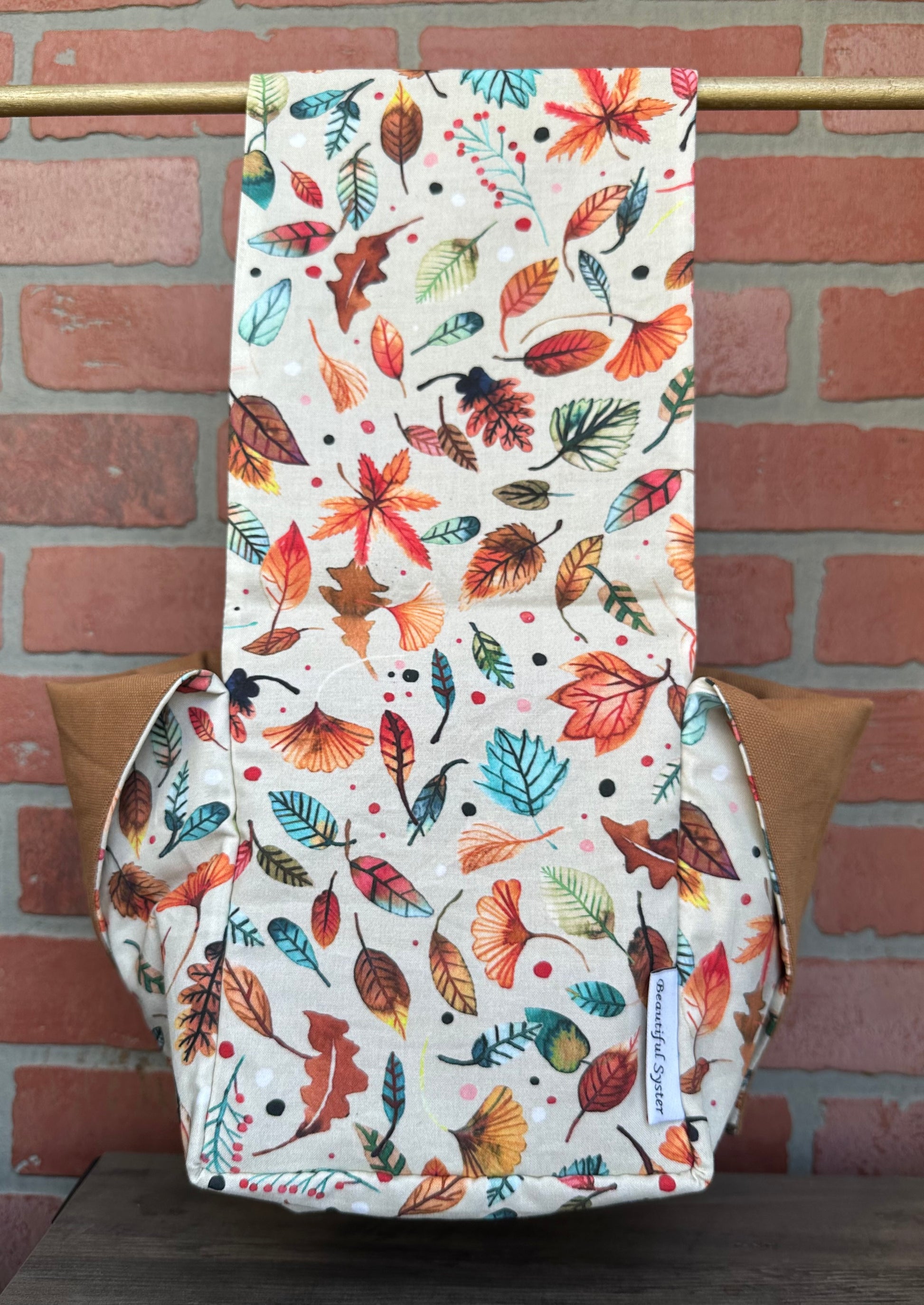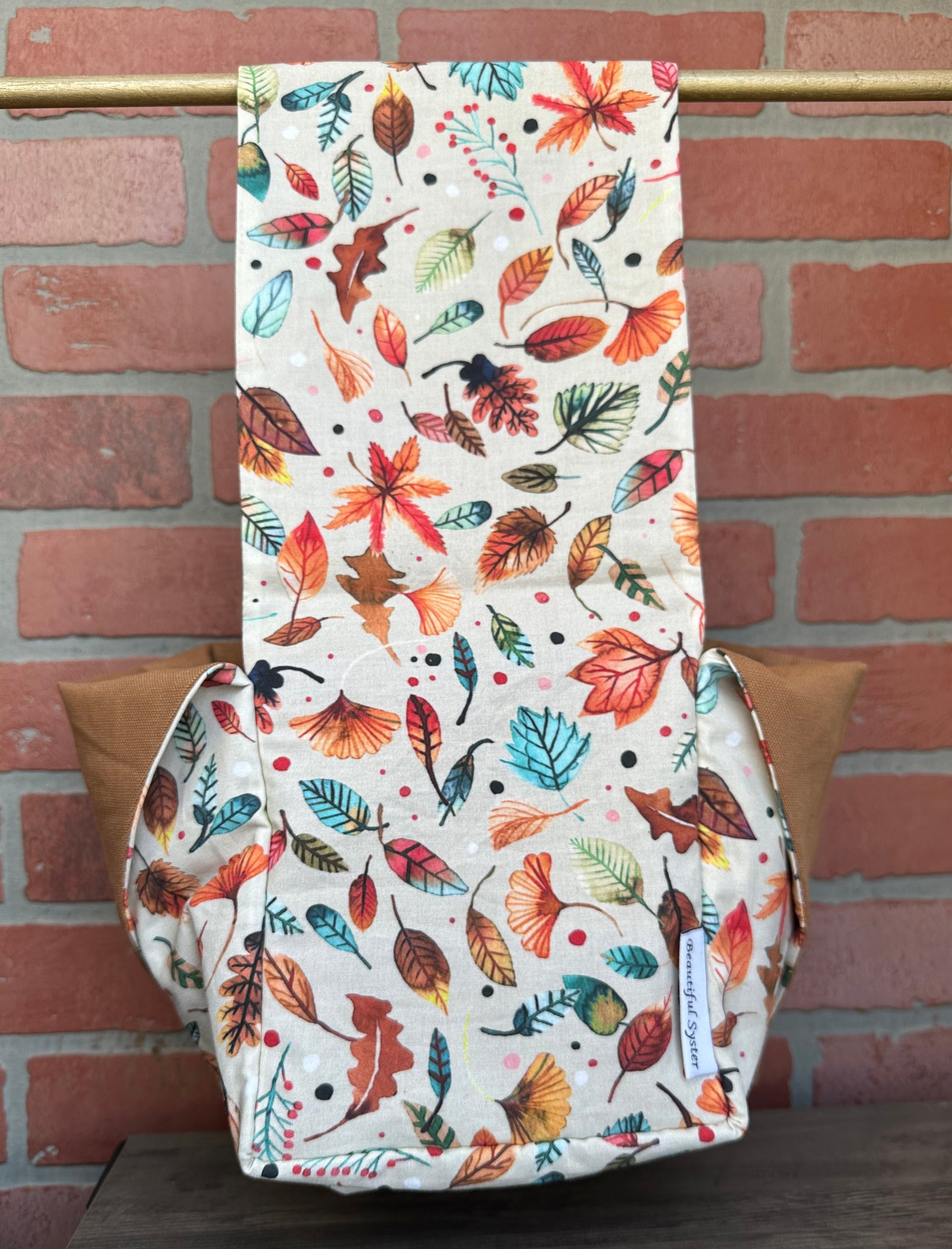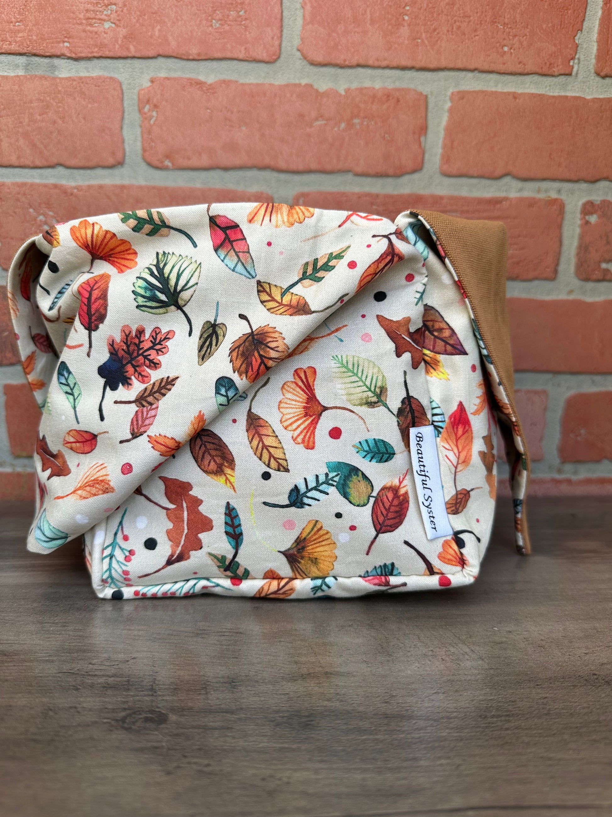This is the perfect on the go project bag. You can carry your yarn in it and knit or crochet while walking or chasing your kids like I do. If you have to move fast just tie it up and all of your things stay safe inside.