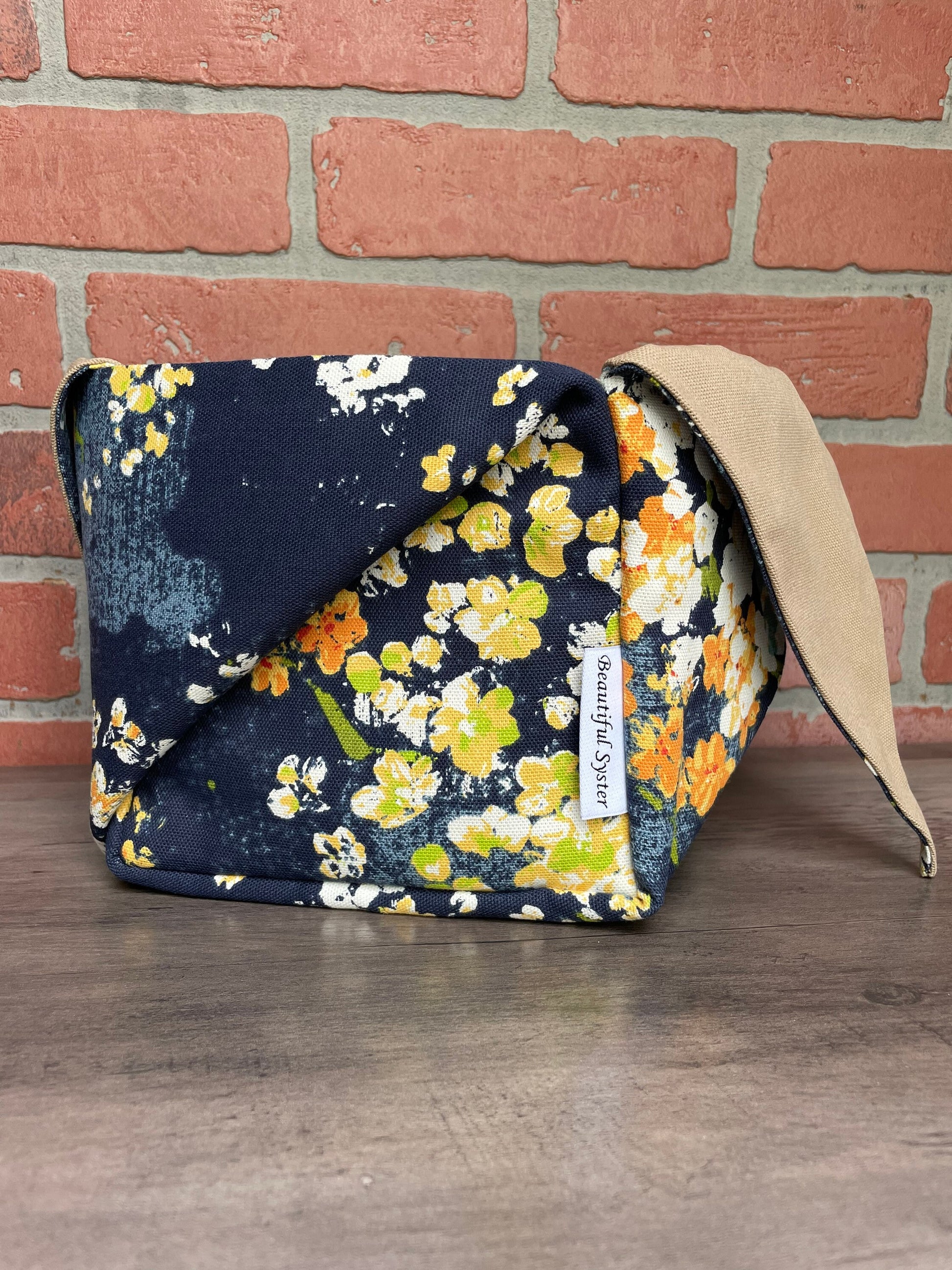 This is the perfect on the go project bag. You can carry your yarn in it and knit or crochet while walking or chasing your kids like I do. If you have to move fast just tie it up and all of your things stay safe inside.