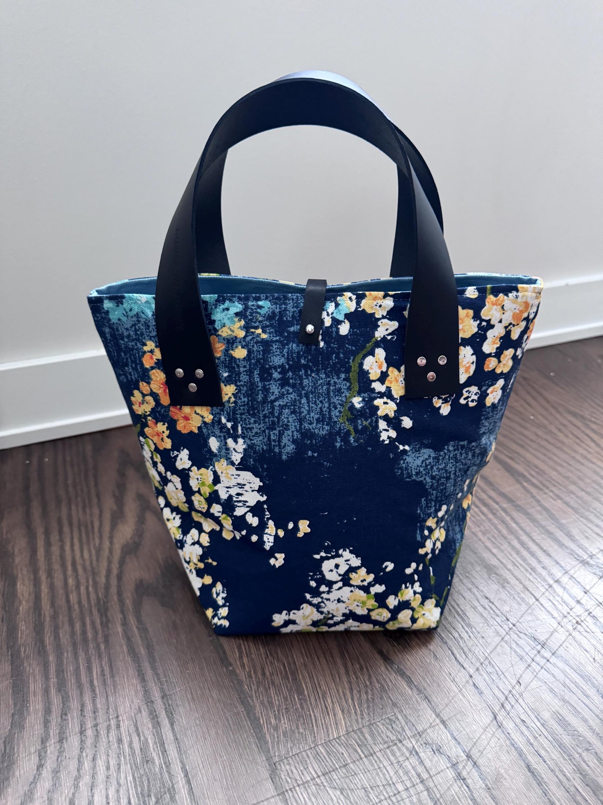 This is our perfect, bigger project bag. It has two pockets inside. A ring which opens on the inside to keep all your stitch markers safe! You keep it closed with a leather clasp, and it has two leather handles to carry around your yarn and everything else you need to knit larger projects like sweaters. You can also take it out with you to use as a handbag.