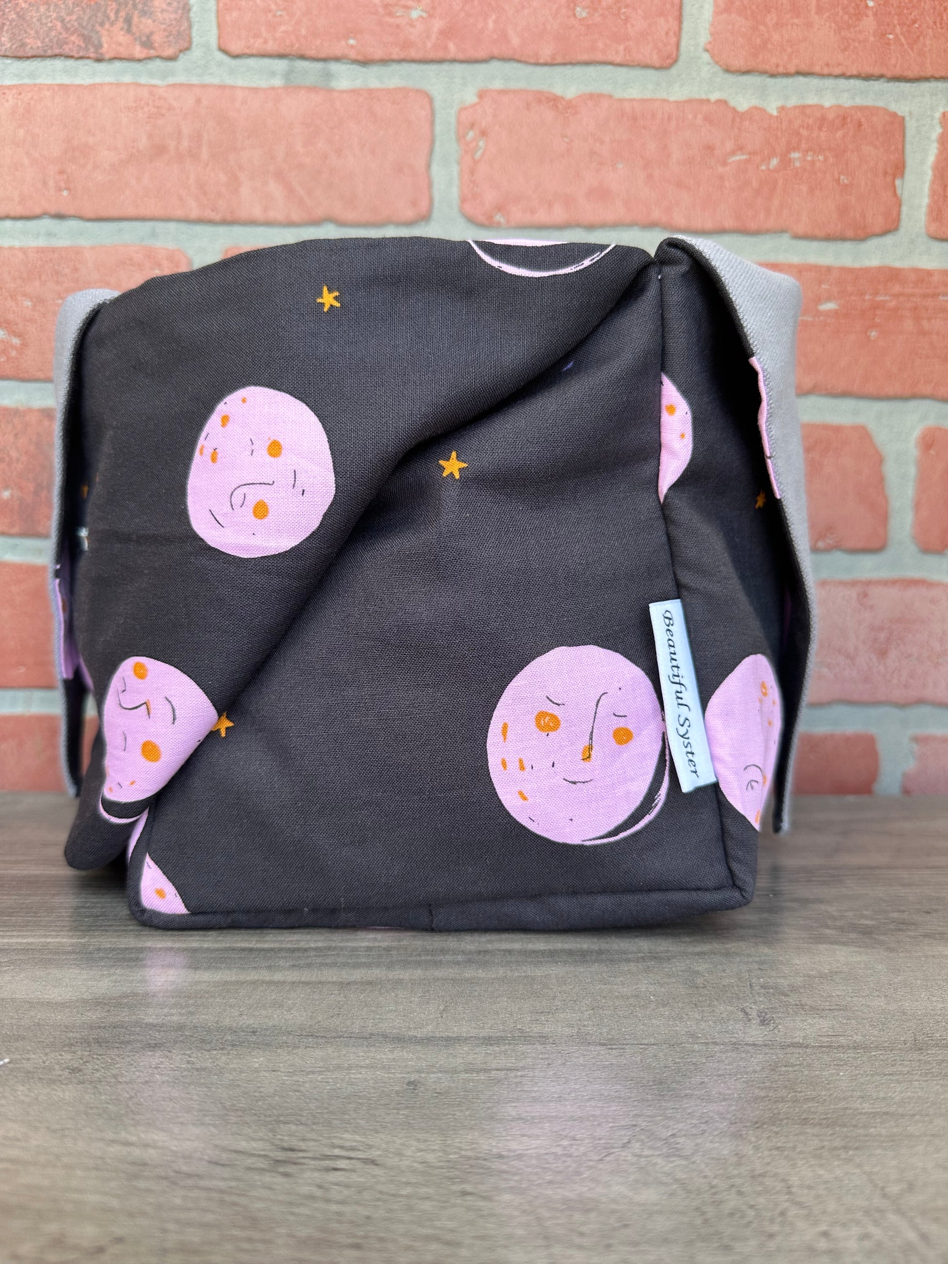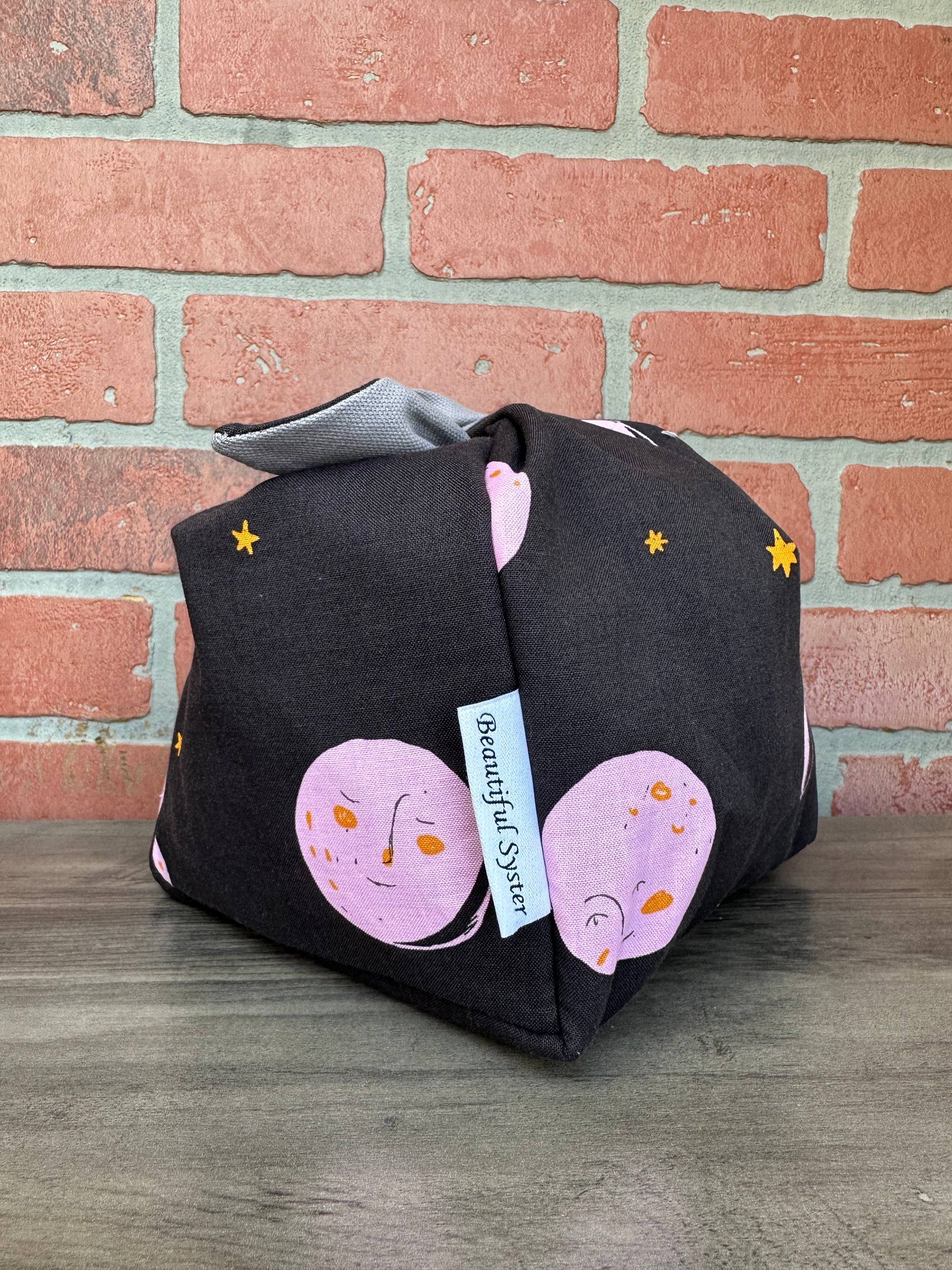 This is the perfect on the go project bag. You can carry your yarn in it and knit or crochet while walking or chasing your kids like I do. If you have to move fast just tie it up and all of your things stay safe inside.