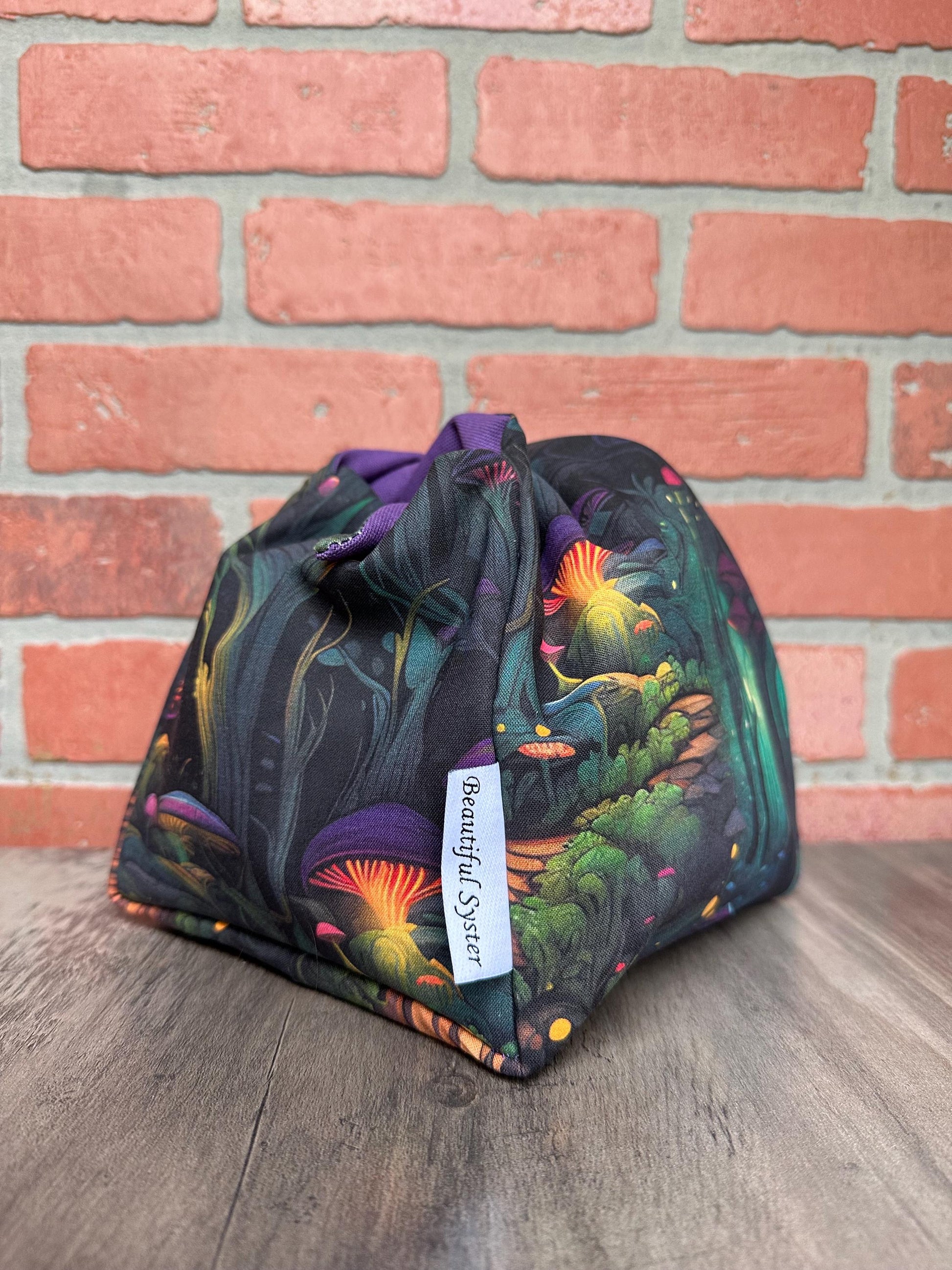 This is the perfect on the go project bag. You can carry your yarn in it and knit or crochet while walking or chasing your kids like I do. If you have to move fast just tie it up and all of your things stay safe inside.
