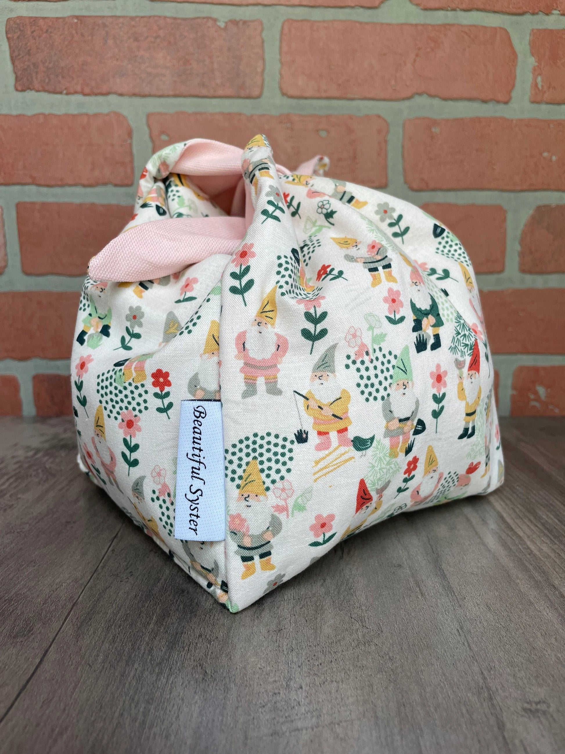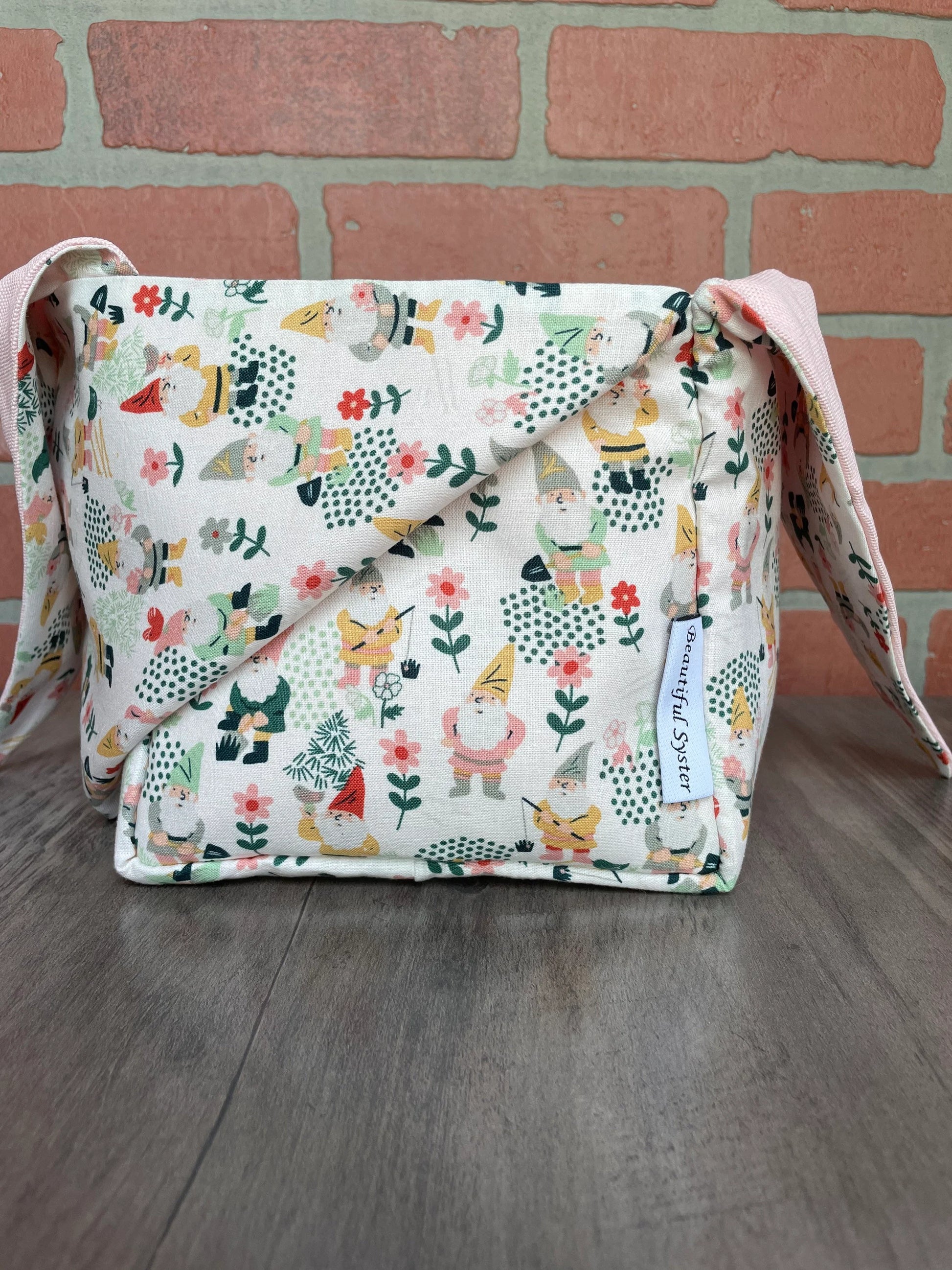 This is the perfect on the go project bag. You can carry your yarn in it and knit or crochet while walking or chasing your kids like I do. If you have to move fast just tie it up and all of your things stay safe inside.