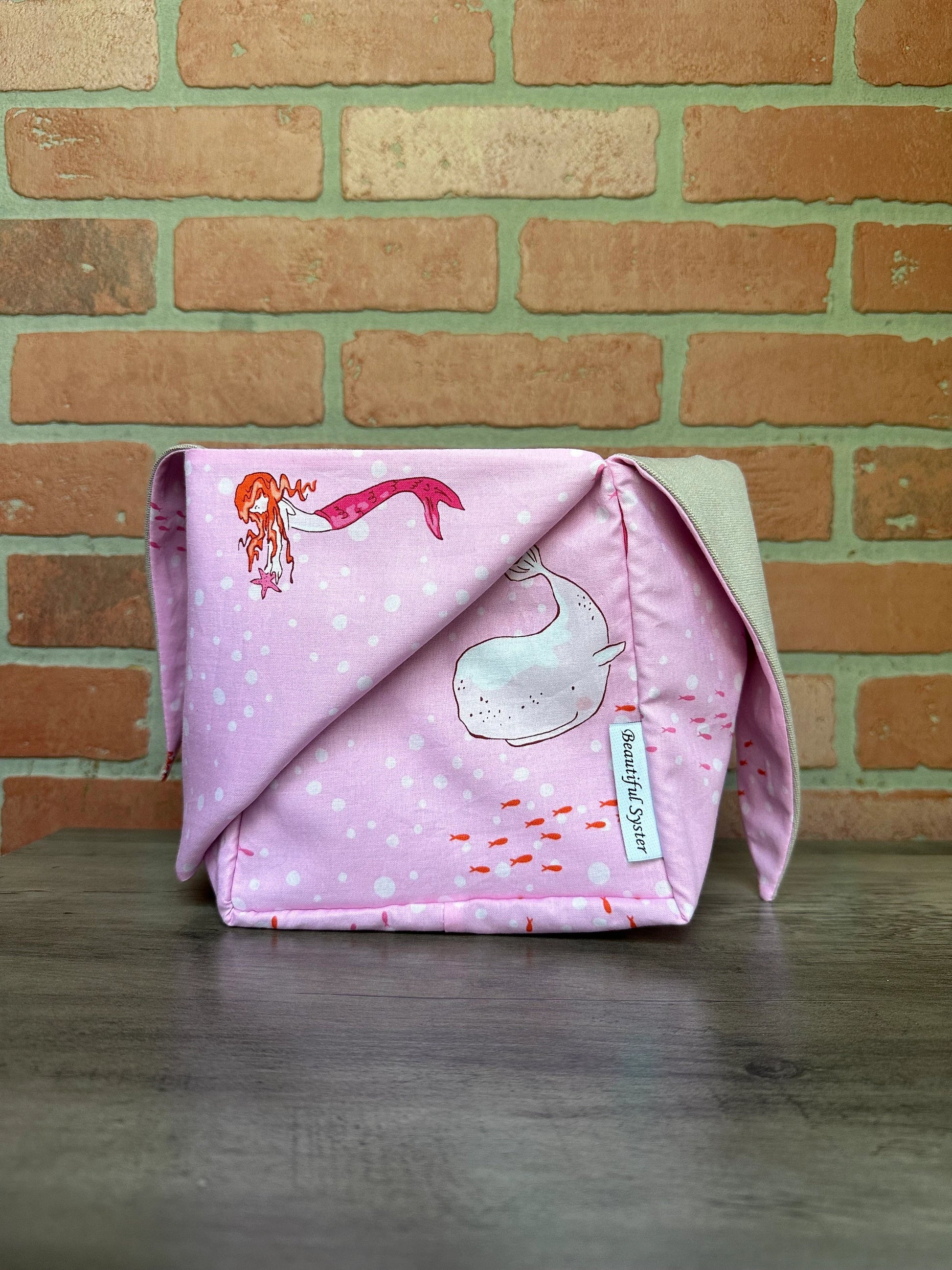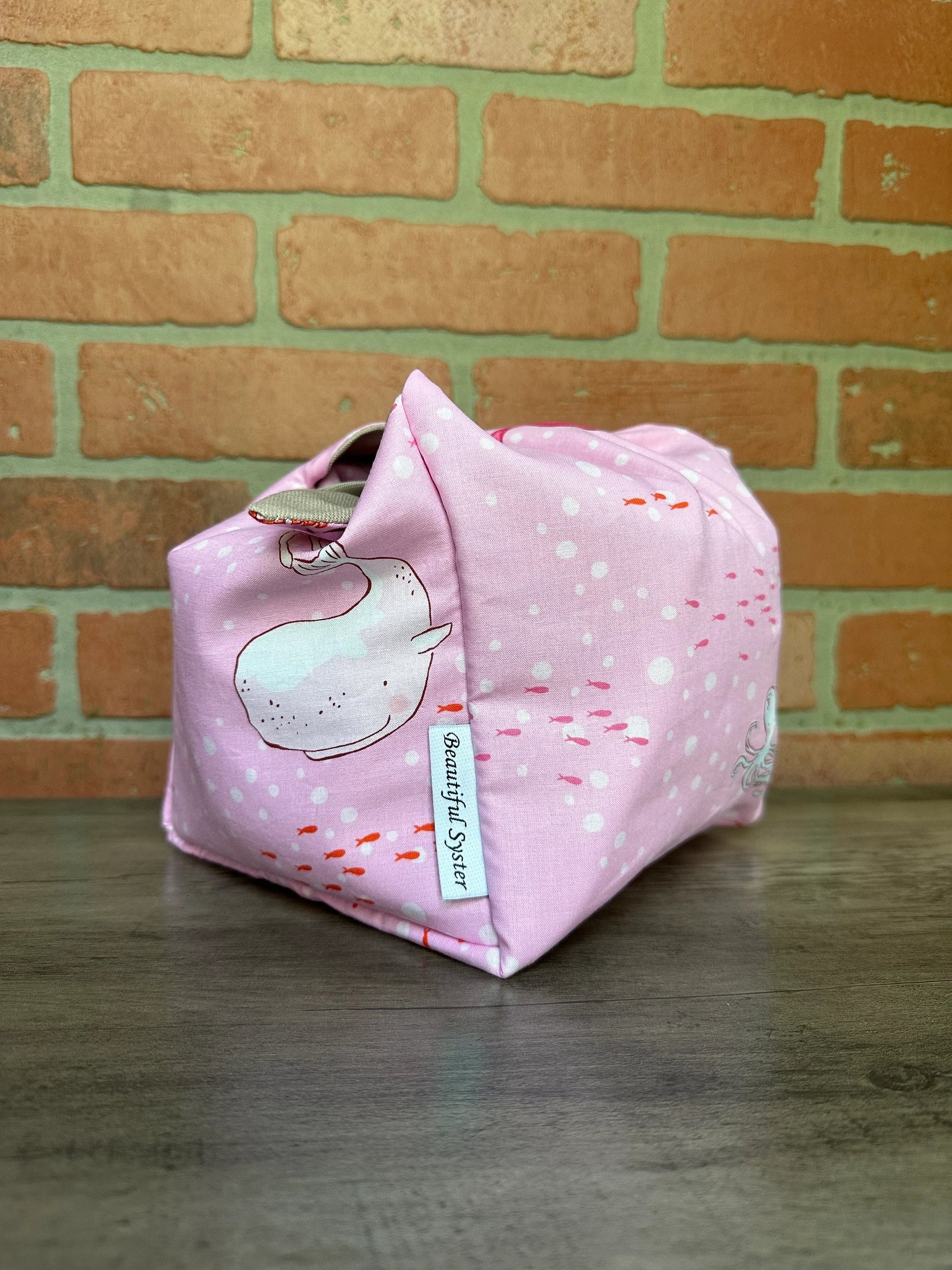 This is the perfect on the go project bag. You can carry your yarn in it and knit or crochet while walking or chasing your kids like I do. If you have to move fast just tie it up and all of your things stay safe inside.