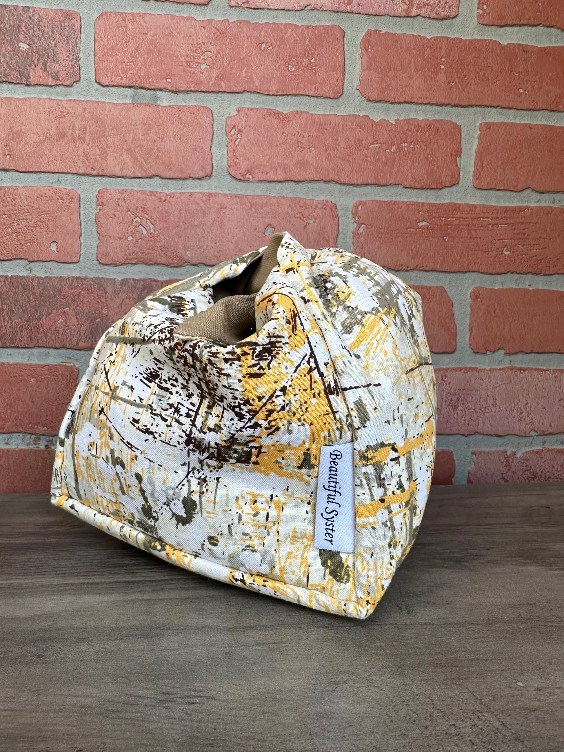 This is the perfect on the go project bag. You can carry your yarn in it and knit or crochet while walking or chasing your kids like I do. If you have to move fast just tie it up and all of your things stay safe inside.