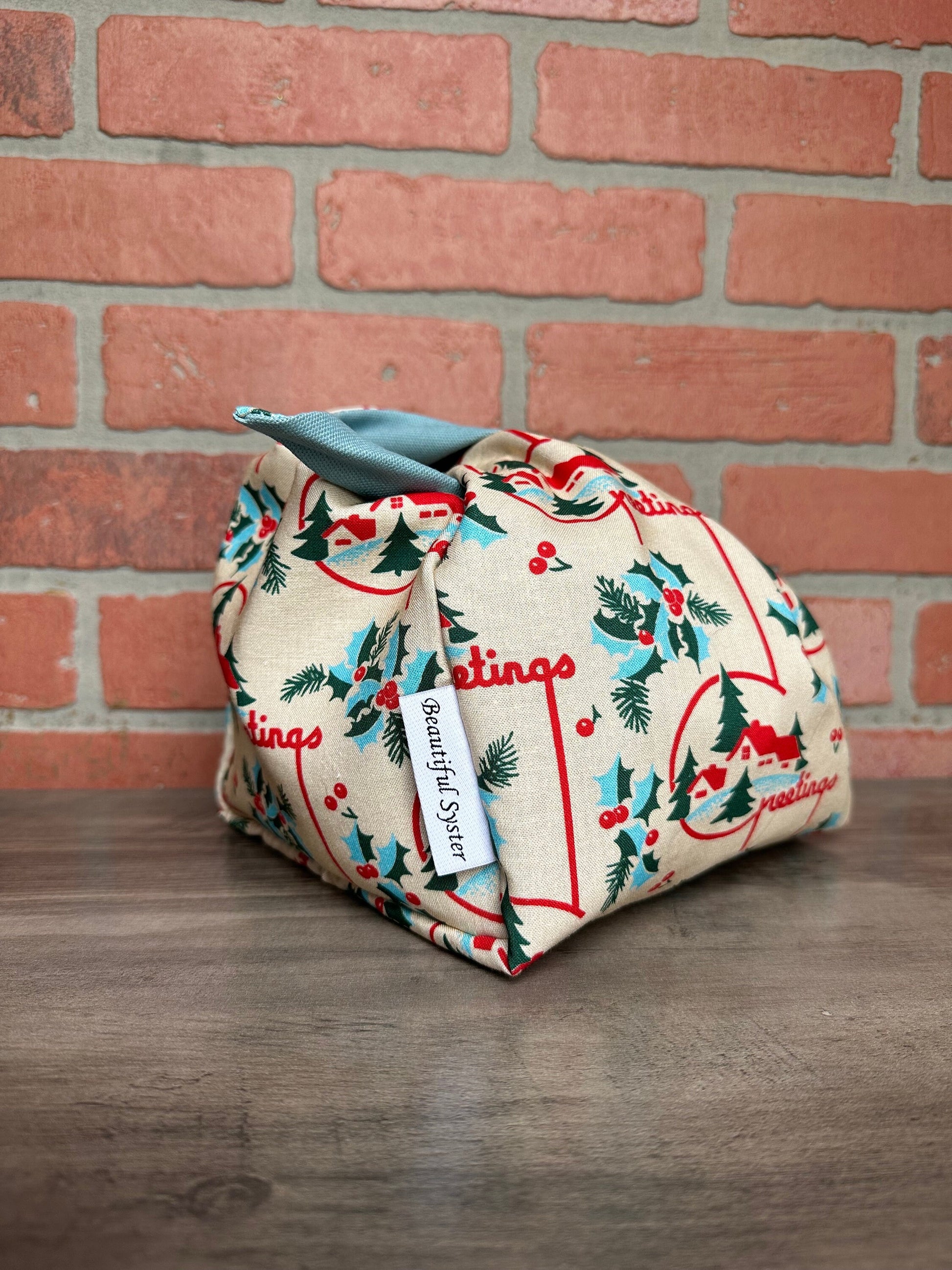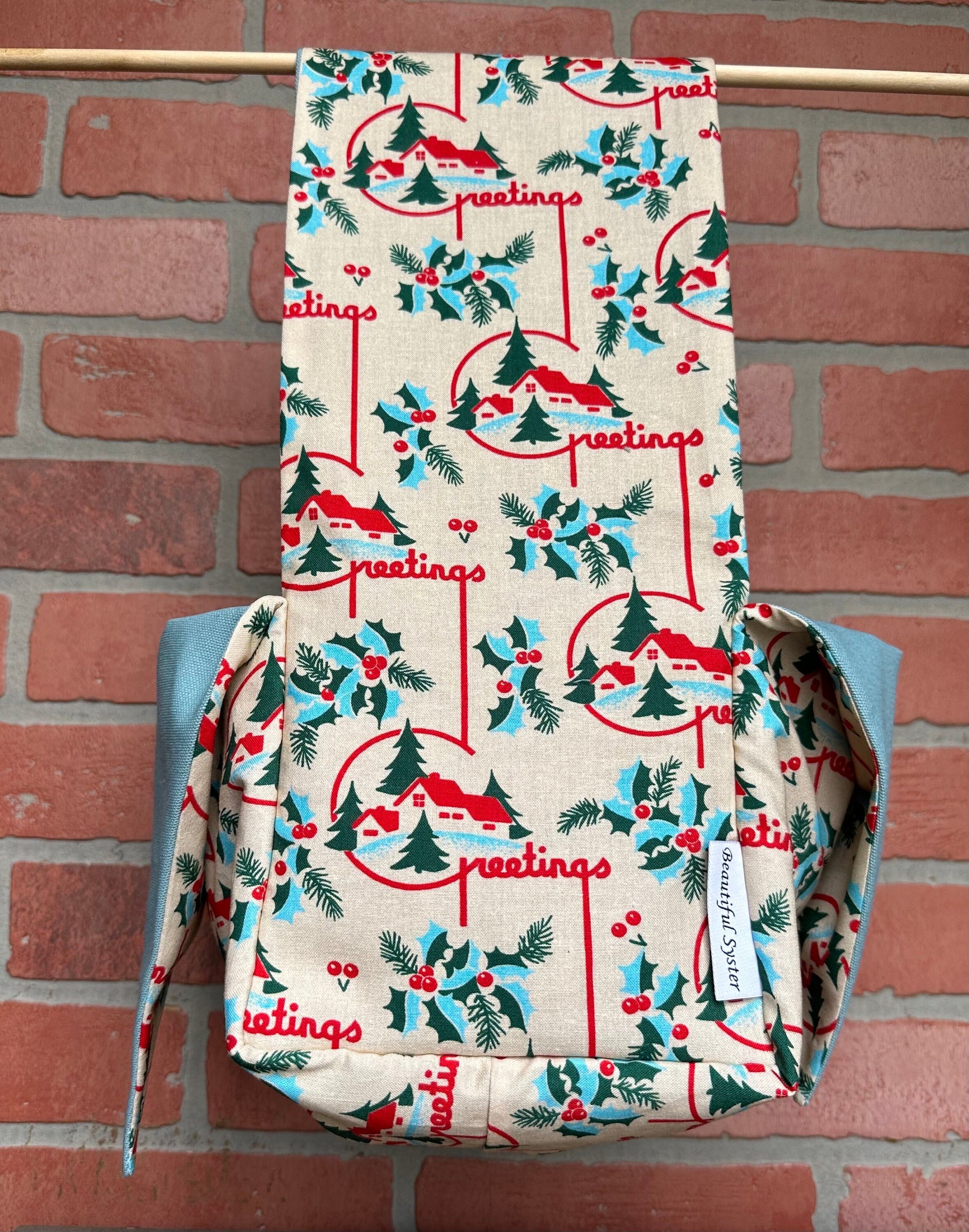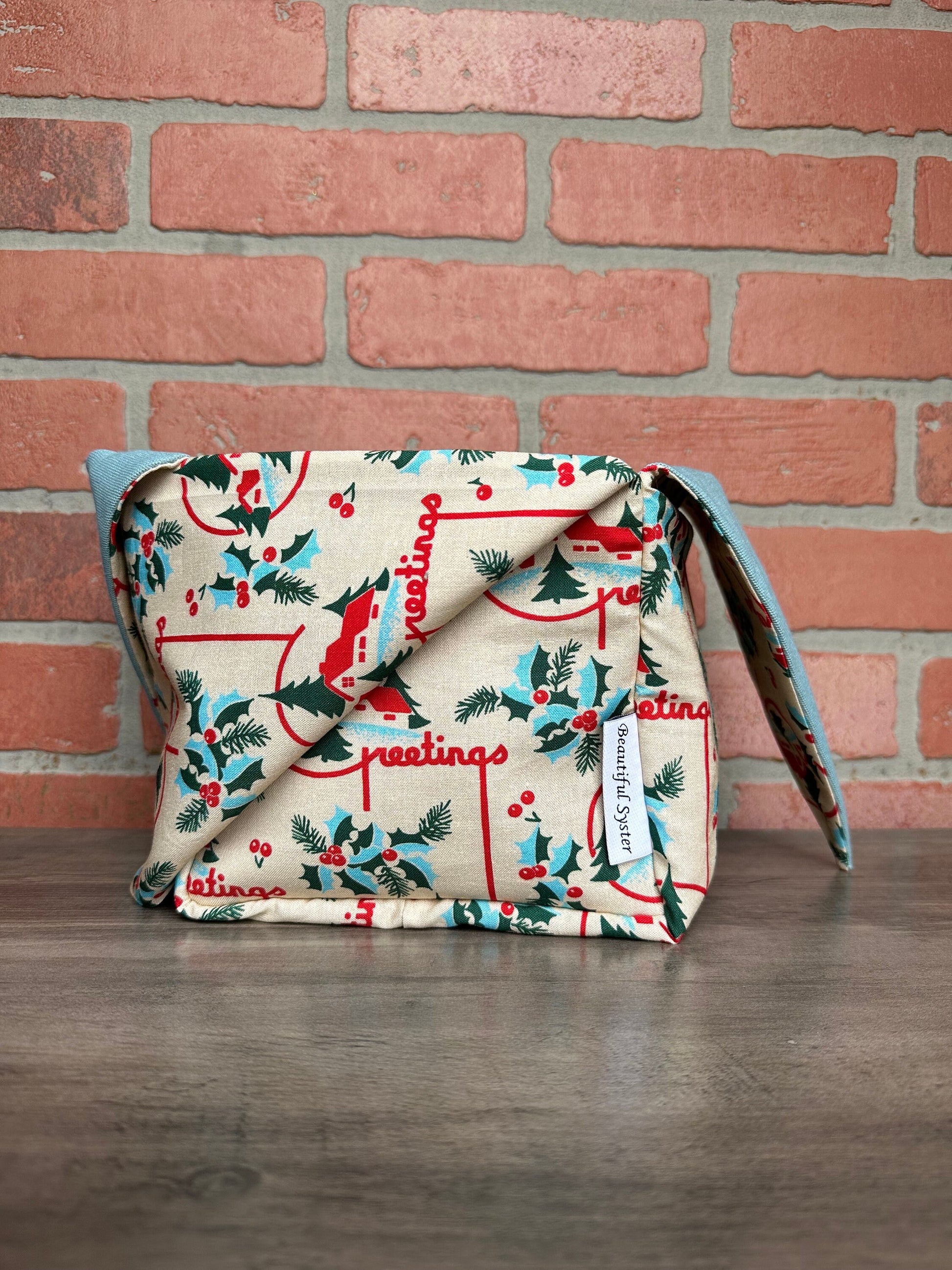 This is the perfect on the go project bag. You can carry your yarn in it and knit or crochet while walking or chasing your kids like I do. If you have to move fast just tie it up and all of your things stay safe inside.
