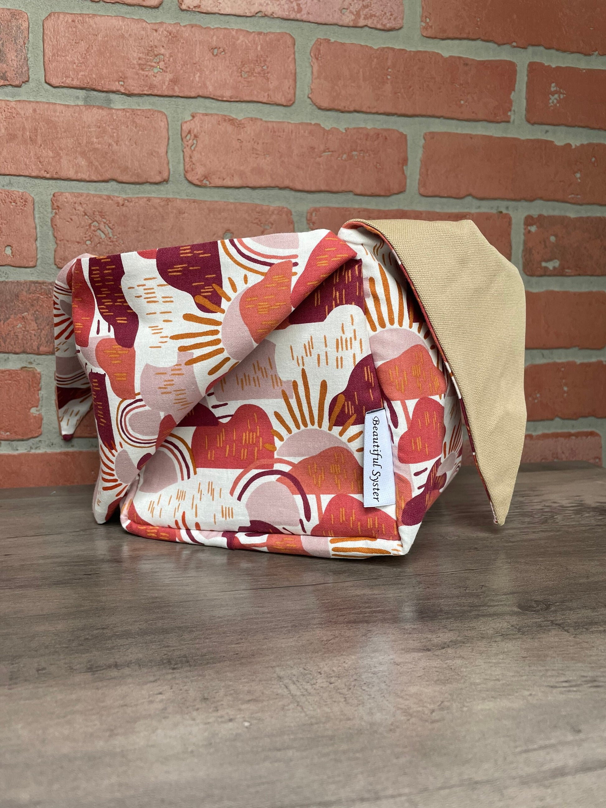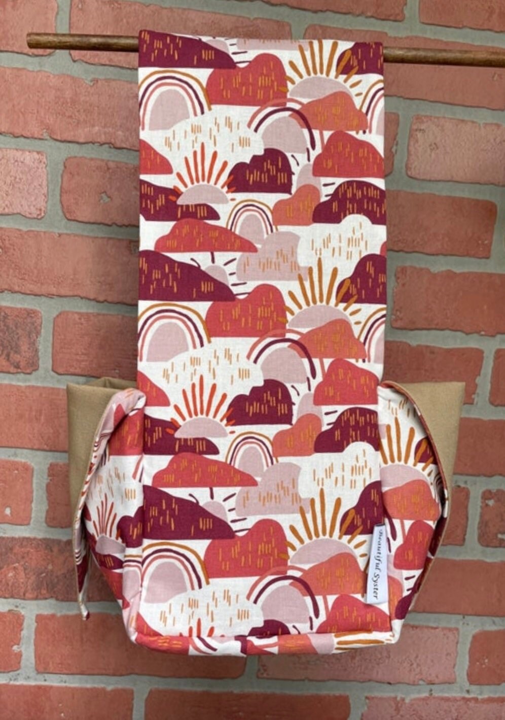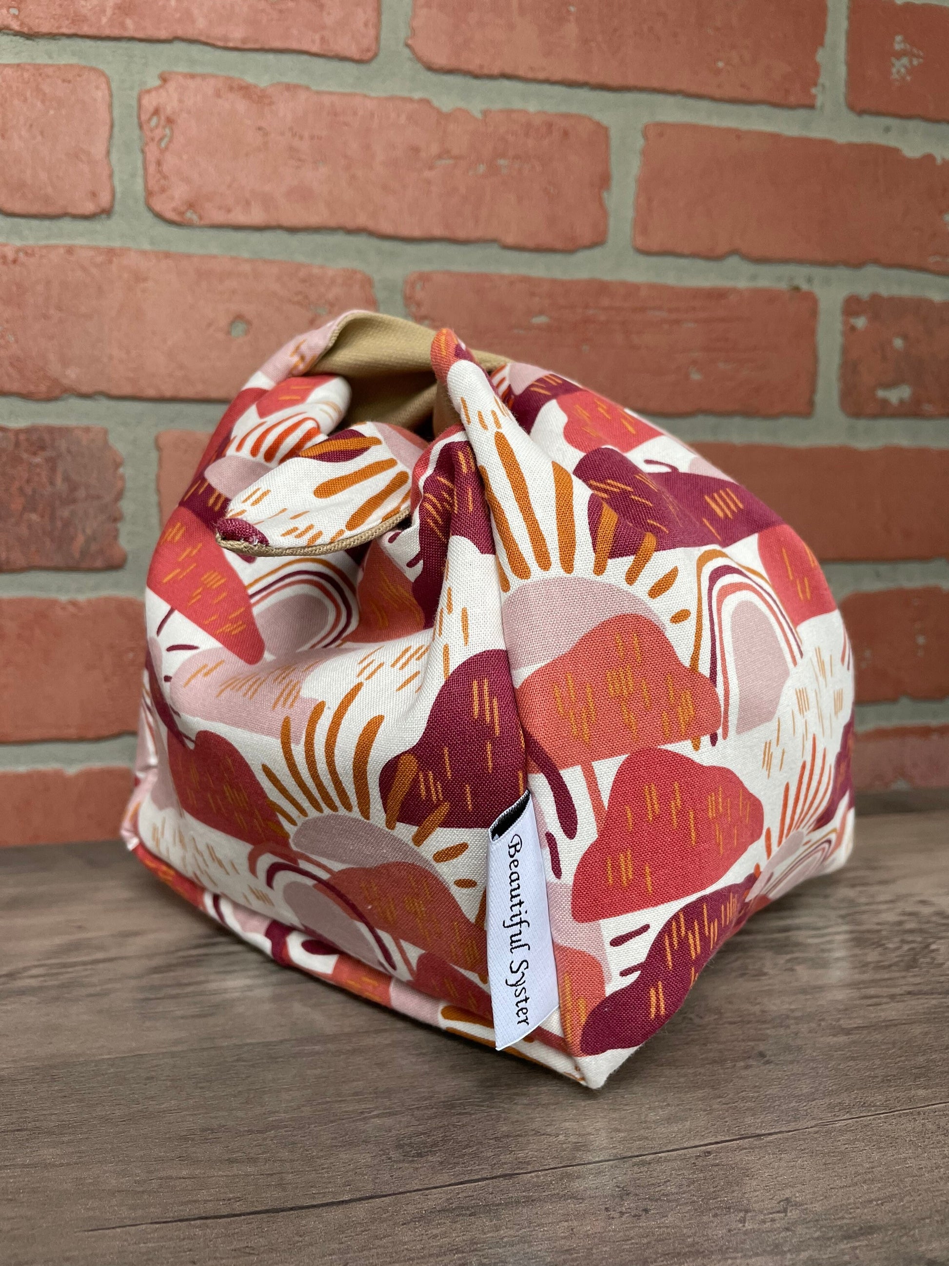 This is the perfect on the go project bag. You can carry your yarn in it and knit or crochet while walking or chasing your kids like I do. If you have to move fast just tie it up and all of your things stay safe inside.