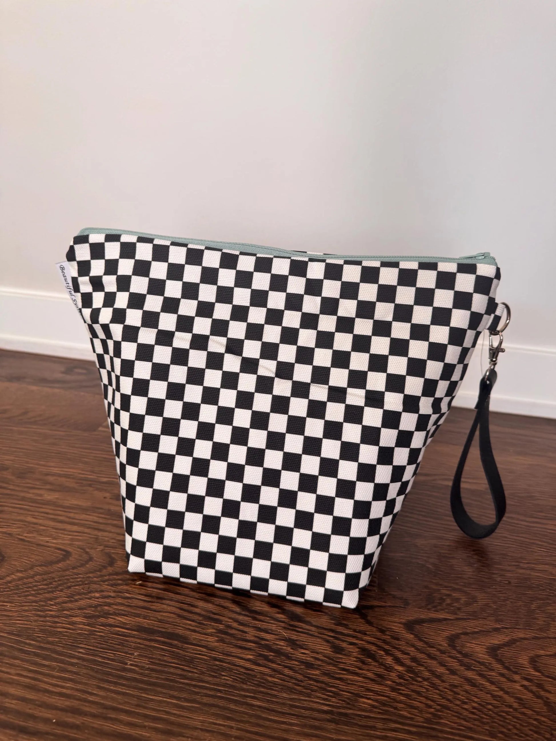 This is the bag for your sweater knitting. It fits your yarn, notions pouch, pattern, and anything else you may need for a project! It has three inside pockets and an attached leash. The leash is NOT for walking and knitting as this is a big bag.